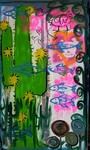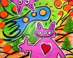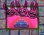 2005Hier is eerst de achtergrond geschilderd, daarna is het schilderij onstaan. Er is om beurten door ons gewerkt met acrylverf en inkt. Uiteindelijk bleek dit 'de droom van konijn' :)