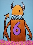 2005Monster in bloemenveld is in goudverf en acryl. De tegenstelling van het enge monster in goudverf maakt het spannend.