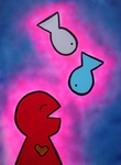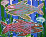 2006Mannetje en de vissen heeft een achtergrond van spuitverf in neonkleur. Daarover is met acrylverf geschilderd.